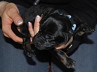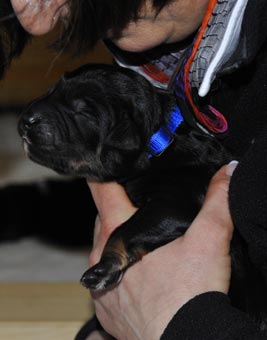 Alle Welpen wurden vom Baby-TÜV gründlich untersucht und gedreht und gewendet. Hier die Herren in Rot (Chico) und Dunkelblau (Cuno)