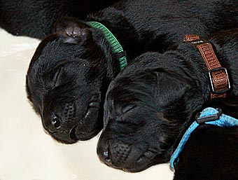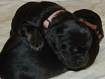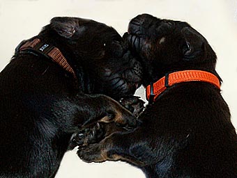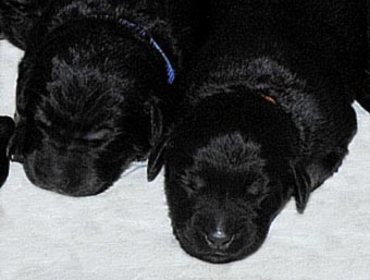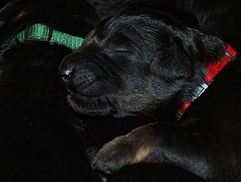Die ersten beiden Welpen: unsere Quotenqeen Chili (natürlich mit rotem Mädchenhalsband) und ihr erster Bruder...