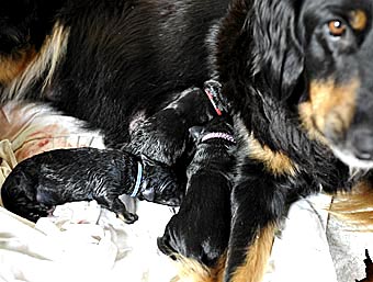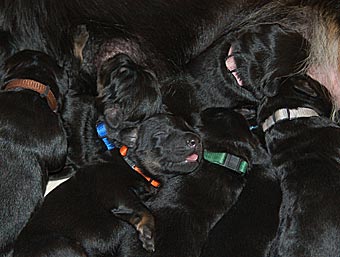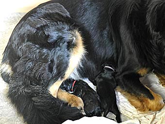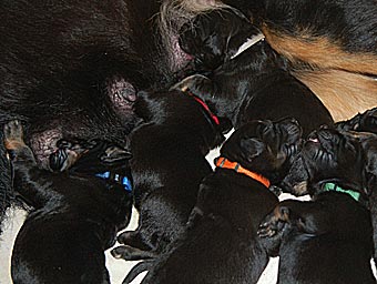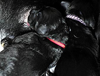 Die Geburt ging ganz leicht vonstatten. Carla wusste genau, was sie zu tun hatte und hat alles wunderbar erledigt. Sie hat die ganze Geburt im Liegen bewältigt. Die neuen Welpen kamen problemlos zur Welt, während ihre älteren Geschwister schon die Milchbar gefunden hatten und die ersten Schlucke Kolostralmilch saugten. Carla hat das prima hingekriegt.