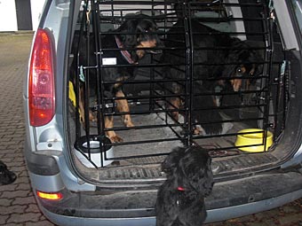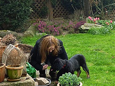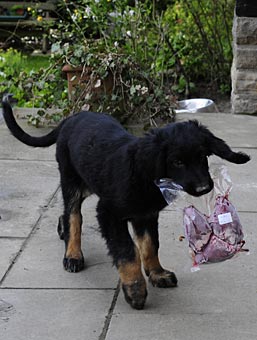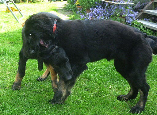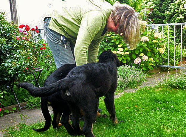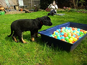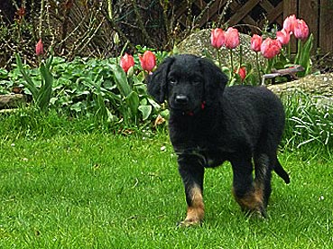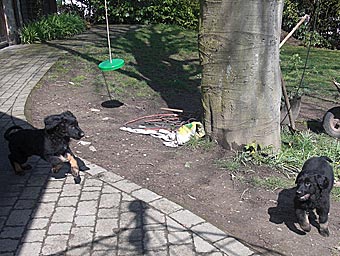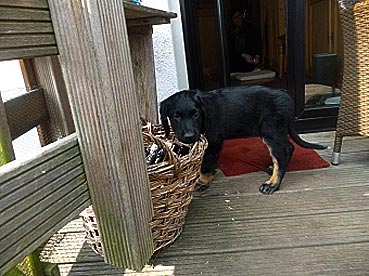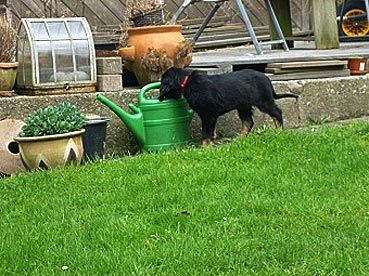 Die Heimfahrt war überhaupt kein Problem. C-Jay hat kaum gejammert, nur am Anfang ein wenig. Zu Hause ging es in den Garten. Er verharrte einen Augenblick und begann dann, sich stückchenweise die Umgebung zu erobern. Es war eine Freude zu sehen, wie sicher und angstfrei der Kerl alles unter die Lupe nahm. Dann ging es ins Haus und ein ordentliches Schläfchen war angesagt. Am Nachmittag ging es dann noch mal in den Garten und dann wurde er schon richtig verspielt, hat getobt und seine Beute getragen. Es scheint ihm in seinem neuen Zuhause bestens zu gefallen und Herrchen ist sehr sehr glücklich. Die ältere Tochter ist auch noch gekommen und meinte, der ist total "cool", weil er alles ohne Scheu und Hektik untersuchte. |