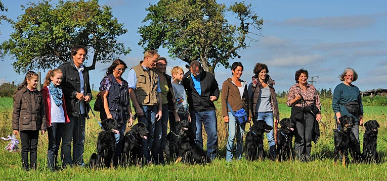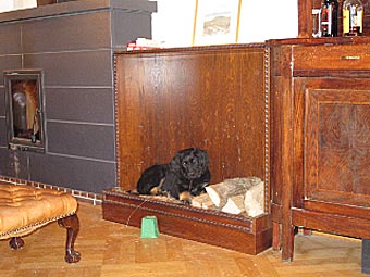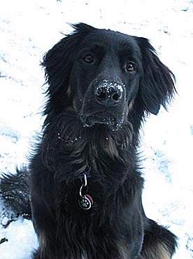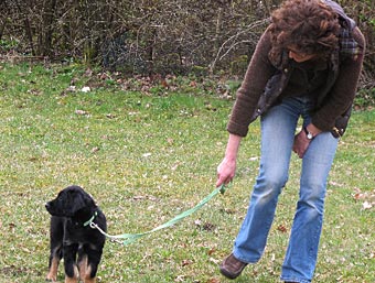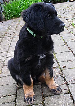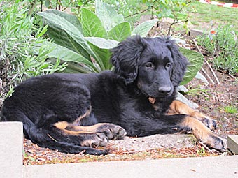Die erste Welpenstunde ist gut gelaufen - nachher waren alle Welpen richtig kaputt. Da es so frisch auf dem Platz war, ist C-Jay mit seiner Familie nachher zum aufwärmenden Kaffee zu Carlos gekommen. Carlos und C-Jay haben dann nur geschlafen! Carlos hat mittlerweile einiges in seinem neuen Zuhause erforscht und hat überhaupt kein Problem, im Garten in der Nähe vom Haus eine kurze Zeit alleine zu bleiben. Er hat Frauchen neulich sogar in der Dämmerung im Garten auf einen Hasen aufmerksam gemacht. Jeden Tag begleitet Carlos mit seinem Frauchen Jakob kurz auf den Weg zur Schule. Dann zeigt er immer wieder, wie freundlich, unerschrocken und interessiert er ist. Den Ochsenziemer hat Carlos ganz schnell hinter der Bank in Sicherheit gebracht > |