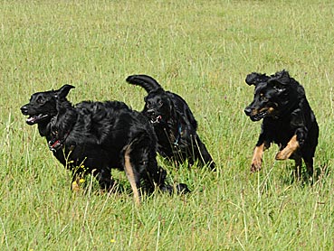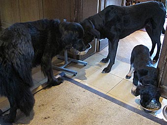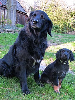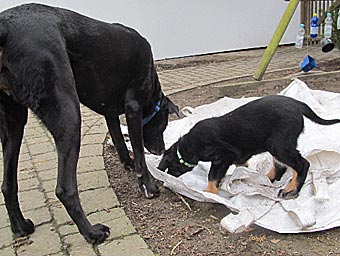 Besonders begeistert war er nachher von der Hündin von Herrchens Bruder, die sehr groß ist und etwas stürmisch sein kann. Er hat sie dauernd zum Spielen aufgefordert ... Zum Schluss haben alle friedlich nebeneinander gefressen - Carlos hat sich nachher sogar gewagt, in Mayla's Napf zu gucken!