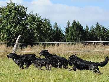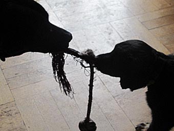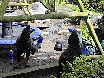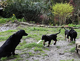 < Im Garten gibt es immer was zum Spielen! Dieses Spielzeug hatte Frauchen dem Wurf geschenkt |