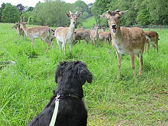 Seit einigen Tagen geht Carlos ab und zu mit ins Gatter zum Damwild. Er hatte die Tiere schon öfter vom Zaun aus erleben können. Frauchen war etwas amüsiert - er interessierte sich lediglich für das was die Tiere auf dem Boden hinterlassen hatten ... es war anscheinend sehr lecker ;-) Die Tiere selbst fand er gar nicht so aufregend! Es war überhaupt kein Problem für ihn, ganz in der Nähe der Tiere zu stehen - und er freute sich auch über ein Stückchen Brot.