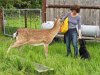 Carlos guckt sich den Hirsch an (Geweih schon abgeworfen) — Rachel füttert Carlos und Hirsch gleichzeitig