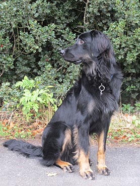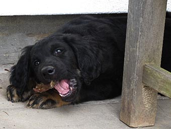 Geburtstagsfoto von Carlos mit 1 Jahr. Er hat zur Ehre des Tages einen leckeren Damwildknochen bekommen und einen ausgiebigen Spaziergang mit einem Retrieverfreund gemacht. Carlos ist ein zurückhaltender, sehr freundlicher Hund. |