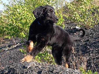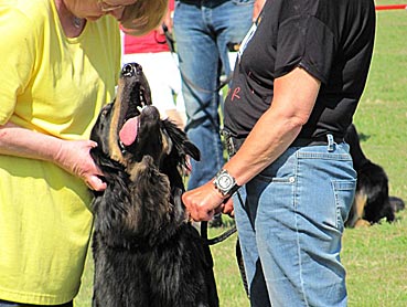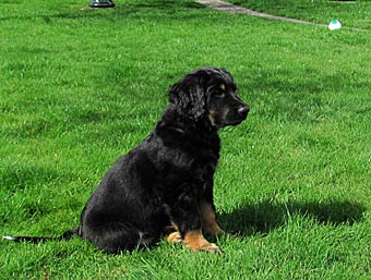 Ein 2 Jahre alter, großrahmiger sm Rüde. Markenzeichnung an der Brust ist nur rudimentär vorhanden, wirkt vom Gebäude noch sehr jugendlich. Typischer Kopf, Ohren leicht nach hinten, mittelbraune Augen, komplettes Scherengebiss. Gerader, fester Rücken, gut getragene Buschrute. In der Bewegung schon flüssig, im Mittelfuß noch weich. Freundliches Wesen.