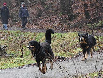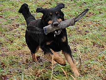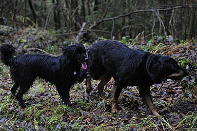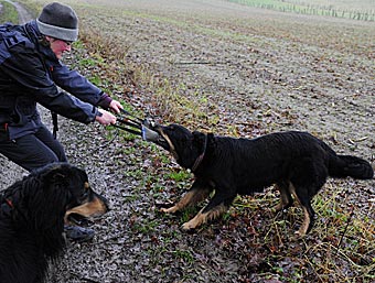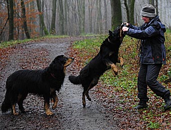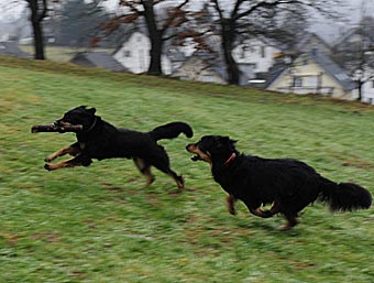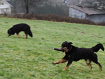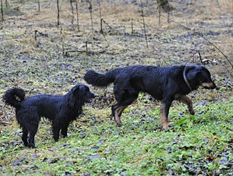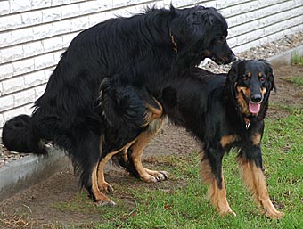 Am nächsten Tag (es war der 11. Tag der Läufigkeit) hatten Lümmel und Carla ihr erstes Date. Eva fuhr mit ihrem Lümmel zu einer Wiese am Ortsrand und wir folgten ihr. Bei Lümmel war es Liebe auf den ersten Blick. Er konnte es gar nicht erwarten, bis Eva endlich das Auto öffnete und als sie ihn raus ließ gab es kein Halten mehr. Lümmel zeigte sich triebstark und temperamentvoll. Die beiden Hunde begannen sofort ein wildes Jagdspiel, bei dem sich Carla anfangs aber noch etwas zierte sobald Lümmel ihr zu nahe kam. Aber es dauerte nicht lange, da erlag sie seinem Charme und ließ ihn aufreiten.