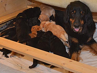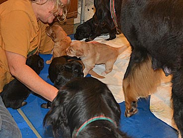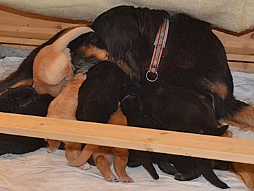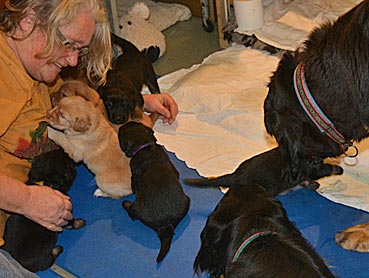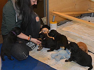 Auch wenn das Welpenzimmer voller Zuschauer ist, widmet sich Carla ganz gelassen ihren mütterlichen Pflichten.
