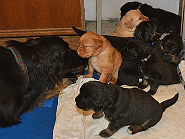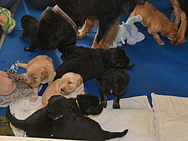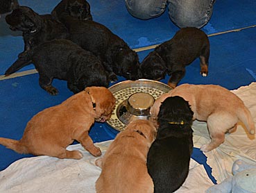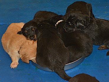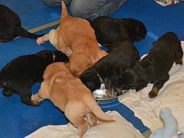 Besuch empfangen ist ganz schön anstrengend - einige Welpen sind ganz einfach in der Futterschüssel eingeschlafen.