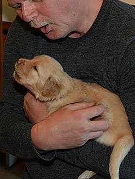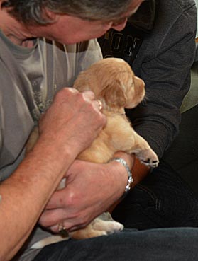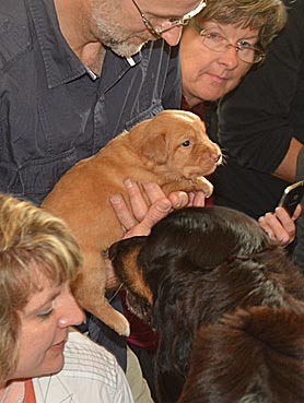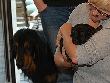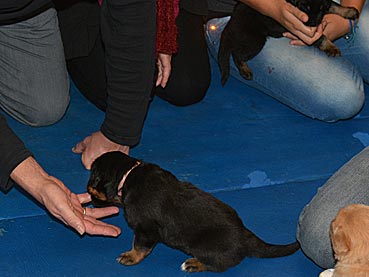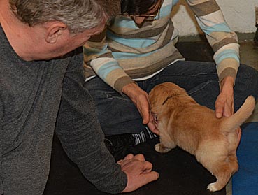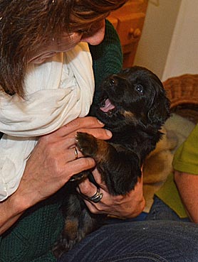 Carla begrüßte alle Gäste freudig und hatte auch keine Probleme damit, als die vielen Menschen das Welpenzimmer bevölkerten.