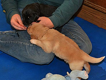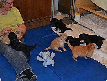 Wir haben das Welpenzimmer übrigens mit verschiedenen Unterlagen ausgelegt, so dass die Welpen ganz nebenbei