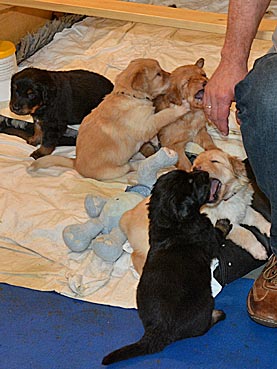 Man kann jetzt immer mehr Interaktionen zwischen den Welpen beobachten. |