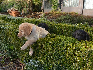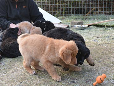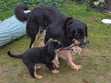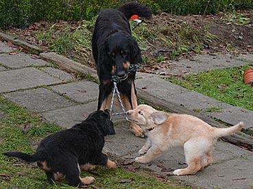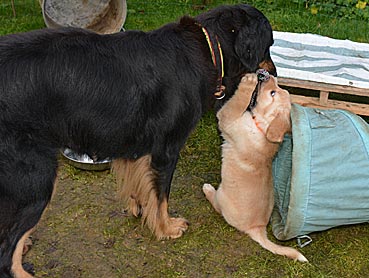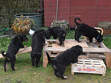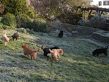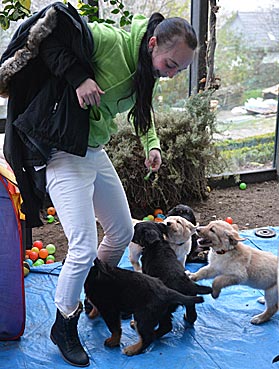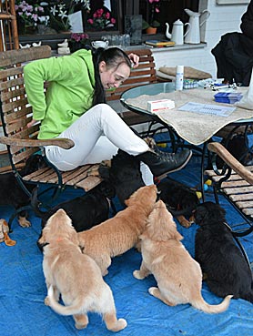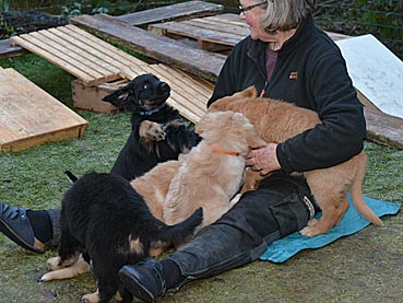 Im Welpenauslauf nahmen alle Welpen sofort aktiv mit beiden Besucherinnen Kontakt auf.