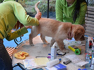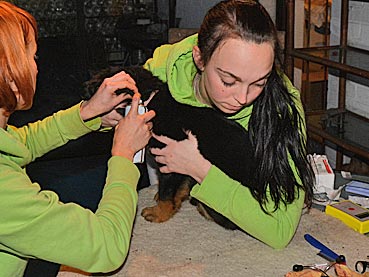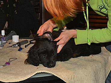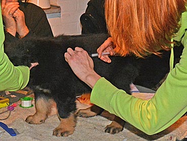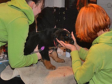 Heute war unsere Tierärztin da und hat den ganzen Wurf gründlich untersucht, geimpft und gechipt.