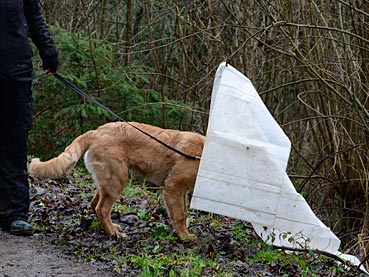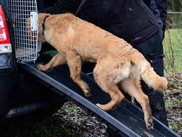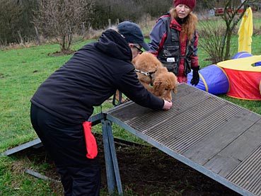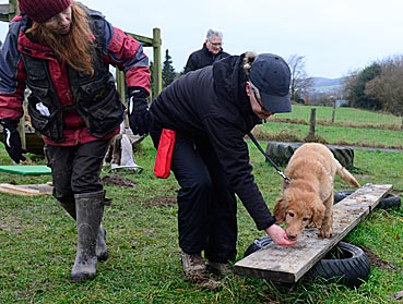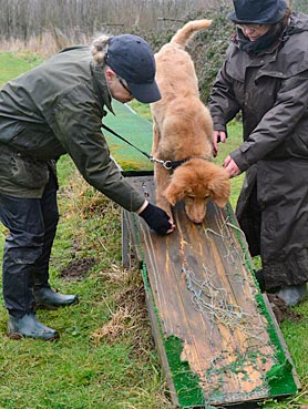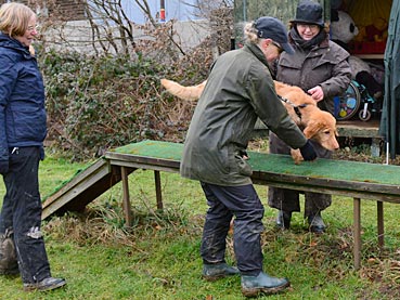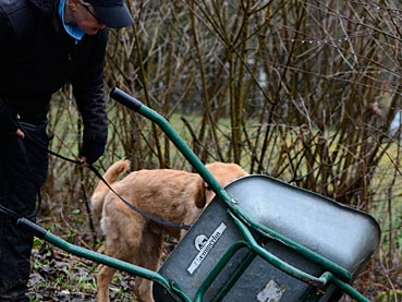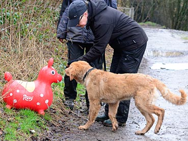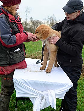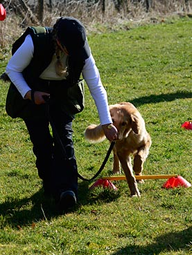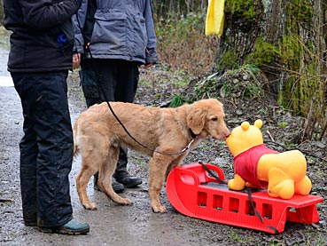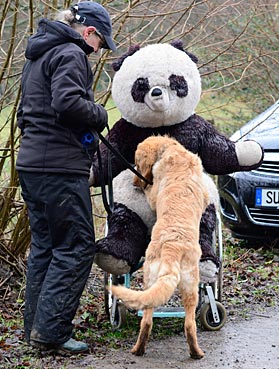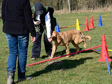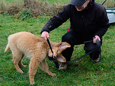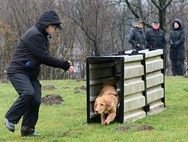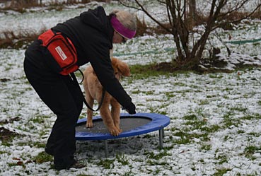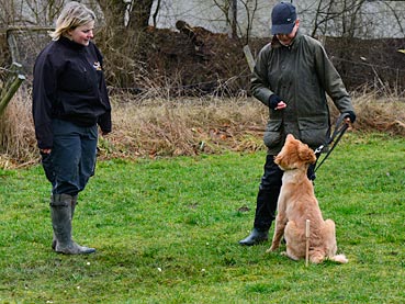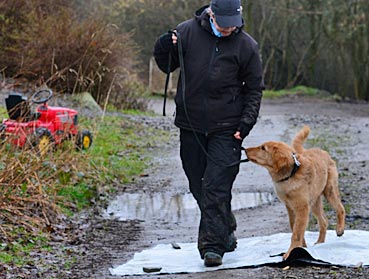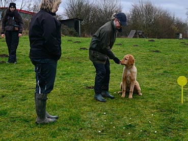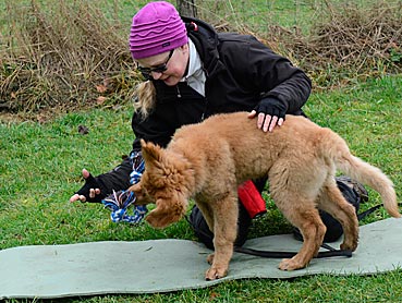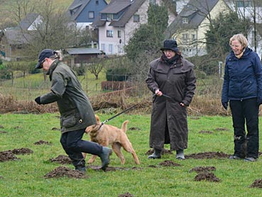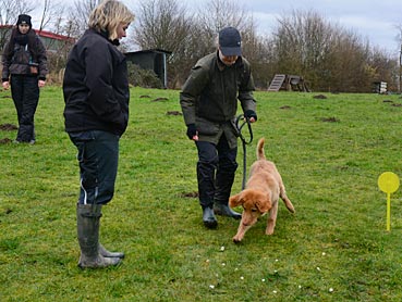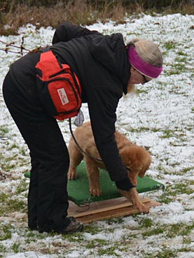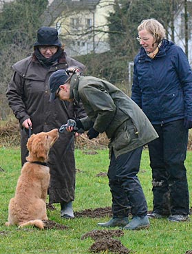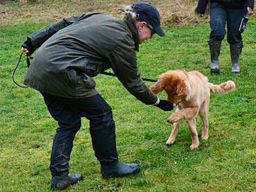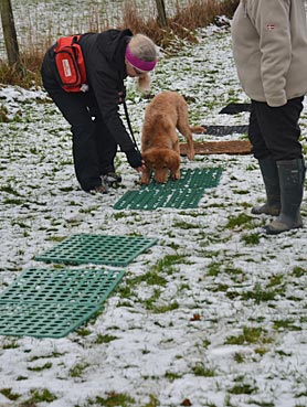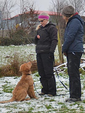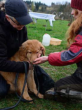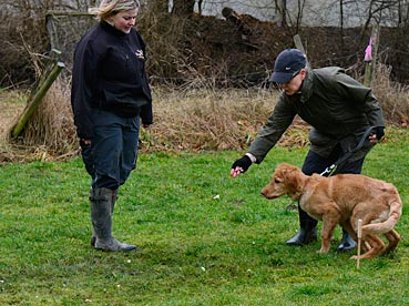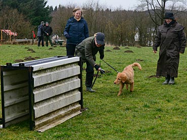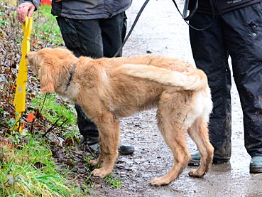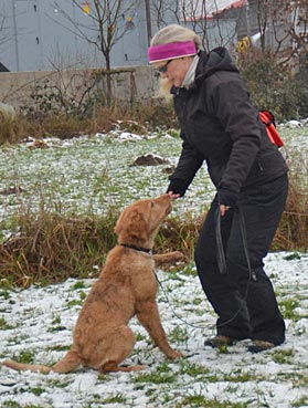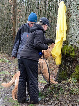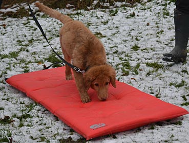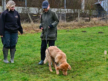 Dante muss erst mal brav absitzen. Dann zeigt Frauchen ihm ein Leckerchen und wirft es in das zertretene Fährtenquadrat.
