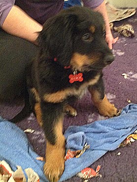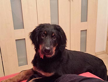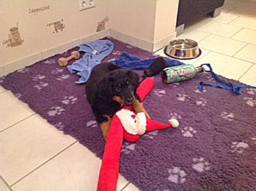 "Die Autofahrt habe ich abgesehen von etwas Heimweh gut überstanden. In meinem neuen Zuhause war alles ganz spannend und aufregend. Habe erst mal getestet, auf was man so alles kauen kann. Manches ging ganz gut, anderes weniger oder ich wurde mit meinem Spielzeug überlistet ... naja muss halt sein ;-)