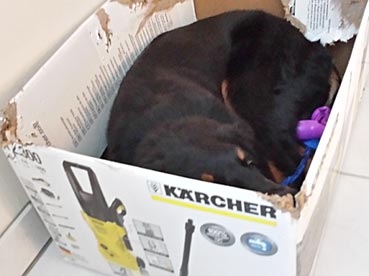 Am Abend bin ich auch ganz freiwillig in meine Box gegangen, das Leckerchen war echt super. Aber als es alle war, war es blöd in der Box ... bis ich mich nach 'ner Weile an den neuen Schlafplatz gewöhnt hatte ... dann ging es alles gut bis heute morgen um 6 Uhr.