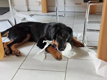 Dina bei einer ihrer Lieblingsbeschäftigung: Wenn man nicht aufpasst, klaut sie das Klopapier und verteilt es ...