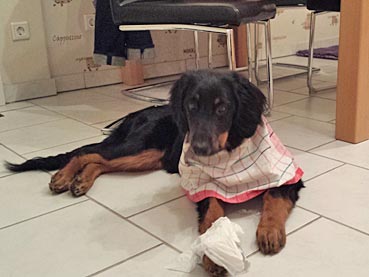 Frauchen hab ihr ein Tuch umgehangen, was sie überhaupt nicht störte.