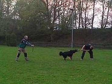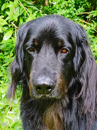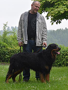Ein 3 1/2 Jahre alter sm-Rüde, derber Typ, kräftiger Kopf, fast dunkelbraune Augen, komplettes Scherengebiss. Behänge, Rücken, Rute und Hoden in Ordnung. Korrekte Winkelungen, vorzügliche Fellstruktur. Die Markenzeichnung ist an den Läufen korrekt, Brustmarken sind unter dem üppigen Fell deutlich sichtbar. Kehl- und Fangmarken sind schwach vorhanden. Flüssiges Gangwerk, freundliches Wesen.