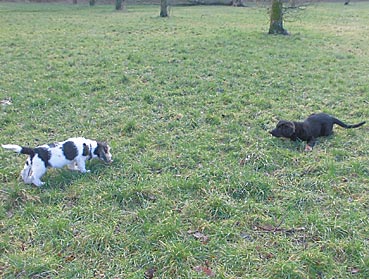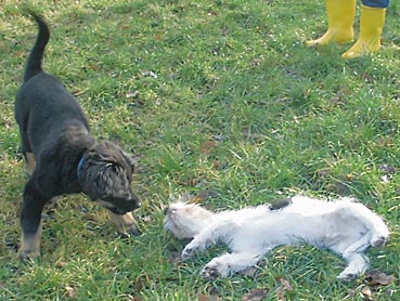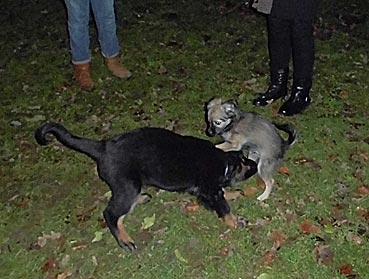 Weiter gehts mit meinem ersten Besuch in meiner neuen, privaten Welpengruppe. Dort habe ich gleich eine neue Kumpeline gefunden und zwar eine Chihuahua-Dame, namens Nutella. Die war sehr lecker, aber auch sehr zickig. ;-D Spielen konnte man trotzdem gut mit ihr, ich war ja auch um einiges stärker. Sie nahm es mit Humor!