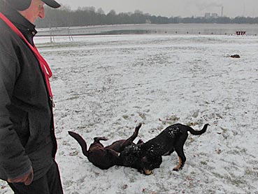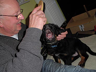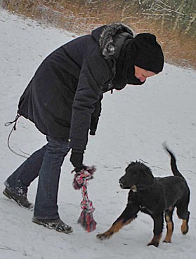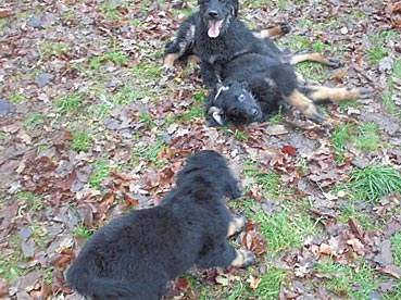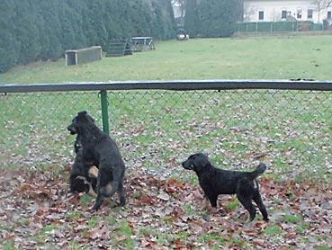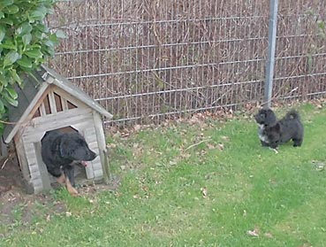 Für mich waren sie schon fast ausgewachsene Hovawarte. Doch ich, als selbstbewusster kleiner Hovi, ließ es mir nicht nehmen auch diese zwei ordentlich zum spielen aufzufordern und gab nicht auf. Immer wieder gab ich Gummi und versuchte sie zu animieren. Da es mit dem animieren durch Bellen nicht immer klappte, ergriff ich die Initiative und biss den zweien einfach mal in ihren Allerwertesten. Daraufhin wurde ich ins Spiel mit eingebunden und ließ mir von den Großen nichts sagen!