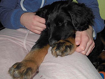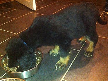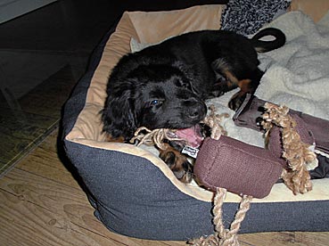 Nach einer schlaflosen vierstündigen Regen- und Nebelfahrt, einigen Pinkelpausen meinerseits, kam ich müde und geschafft in meinem neuen Zuhause an. Nach der ersten interessierten Revierbegutachtung und vielen neuen Eindrücken, stellte ich erstaunt fest, dass mein Haus auch einen Garten besitzt. Diesen habe ich schon ausgiebig inspiziert! Nach einigen Kämpfen mit (Plüsch-)Wolf und Löwe, gab es endlich die verdiente Raubtierfütterung ( ... es hätte mehr sein können!)