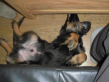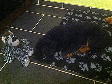"Danach durfte ich mein Wohnzimmer erkunden: Die Hovi-typische Schlafstellung beherrscht er auch schon > |