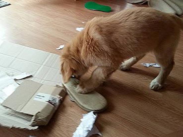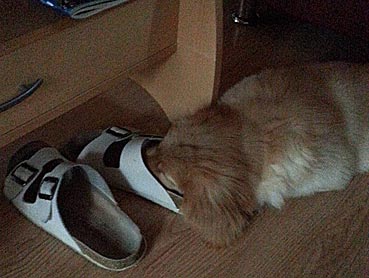 Delphi ist mit allen Wassern gewaschen ;-) ... langsam und sicher tastet sie sich an die Schuhe ran ... NOCH knabbert sie sie nicht an ...