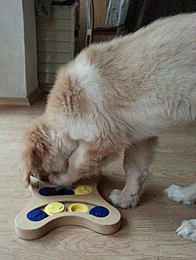 "Flauschi" hat ein sogen. Intelligenzspielzeug für Hunde bekommen. Unter jeder Scheibe befindet sich ein Hohlraum für Leckerchen.