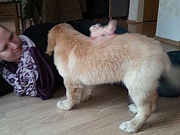 Am 15. Januar war die erste Welpenstunde mit 6Welpen. Es war noch eine Hovidame dabei, die 3 Wochen jünger ist. Der Rest waren verschiedene Rassen. Delphi ist die Größte dort und springt notfalls über die Kleinen drüber. War lustig und sie hat sich richtig ausgetobt. Die Welpentrainerin sagt: "die hat richtig Pfeffer im Hintern".