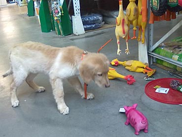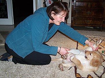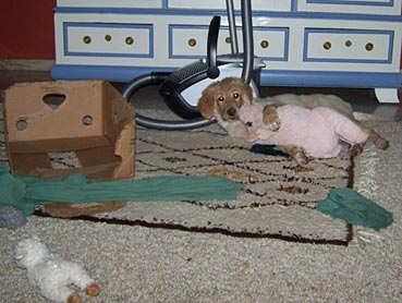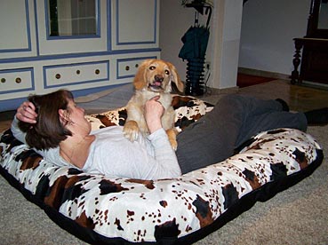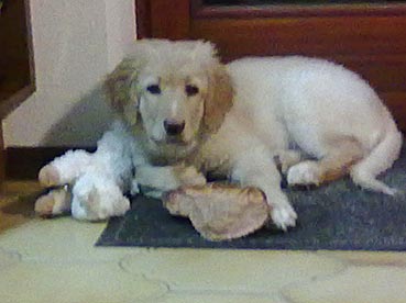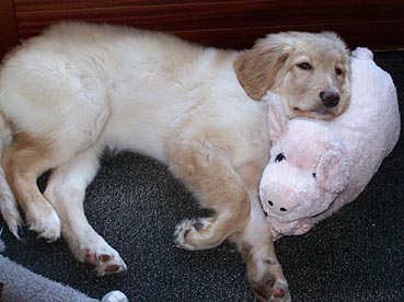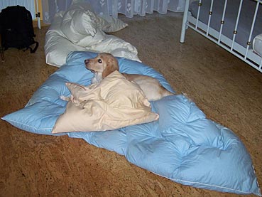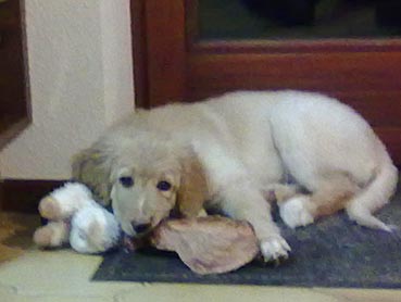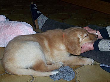 Gestern Abend ist sie ohne zu jaulen die ganze Nacht über in ihrer Gitterbox (neben Herrchens Bett) mit ihrem Plüsch-Schweinchen und der Decke von Zuhause geblieben. Um 5 Uhr morgens wurde sie etwas unruhig; Herrchen ist vorsichtshalber zum pieseln mit ihr raus und dann wurde gekuschelt ...