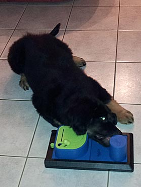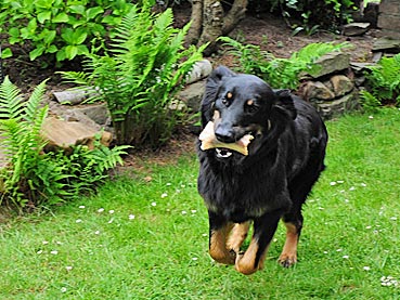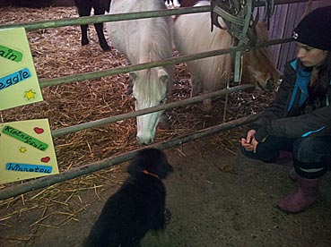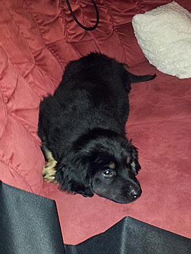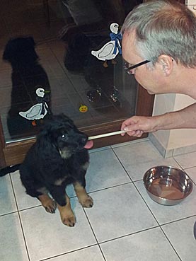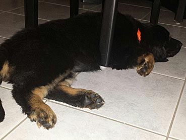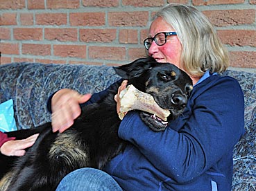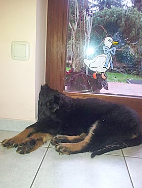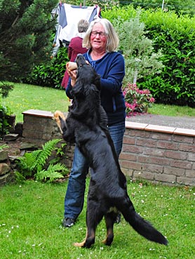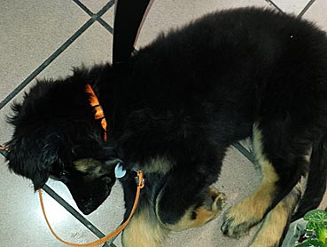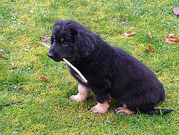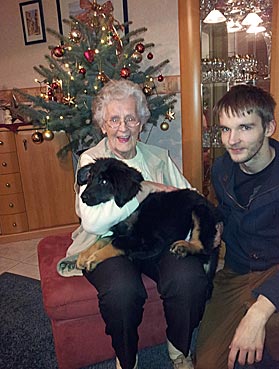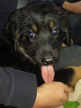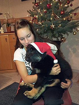 " 24 Tage bin ich jetzt schon hier, hab viel Spaß gehabt und habe viel gelernt. Ich bin schon groß geworden, meine Rippen spürt man super trotz kleiner Leckerlies. Ich werde hier toll beschäftigt, denn die Familie ist auch mit der Oma (6 Leute) recht groß. Damit habe ich viele Spielpartner und Spaziergänger, obwohl mein Herrchen leider noch etwas Fußlahm ist. Inzwischen weiß ich wie man im Kaufhof seinen Haufen ablegt (und dort von Herrchen entsorgen lässt), Fahrstuhl fährt und auf dem Weihnachtsmarkt belästigt wird. Zu Familienfeiern und Gaststättenbesuchen wurde ich auch schon mitgenommen und habe mich super benommen. "