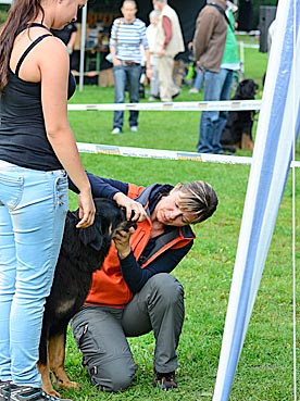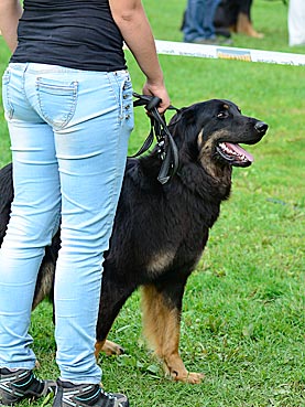 11 Monate alte, gut mittelgroße, schlanke, kräftige sm Hündin. Das Haarkleid ist knapp in der Länge und Struktur und hat an der Brust leichten bräunlichen Anflug. Knapp mittelblonde Marken. Korrekte Läufe im Stand. In der Hinterhand stark eng, vorne lose und teilweise hochtrabend. Im Kreis mit aufgezogenem Rücken und in der Hinterhand gehemmt. Korrekte Rutenhaltung mit leicht verspannter Rutenspitze. Etwas grau an den Hosen. Komplettes Scherengebiss, korrekte Ohren, schöne dunkle Augen, korrekte Pigmentierung und Lefzen. Freundliches, verspieltes Wesen. Auf Grund ihrer gehemmten Bewegung in der Hinterhand bekommt sie ein 'gut'.