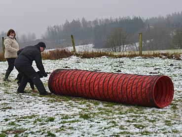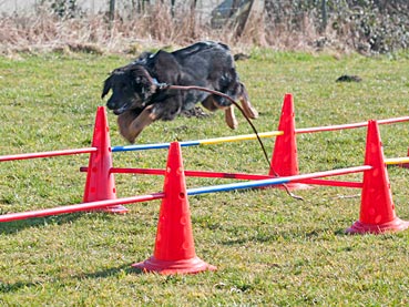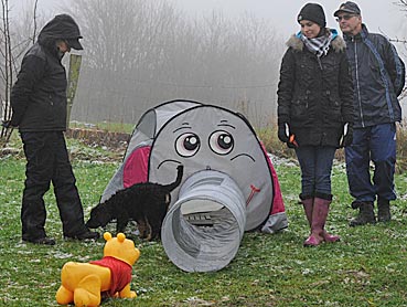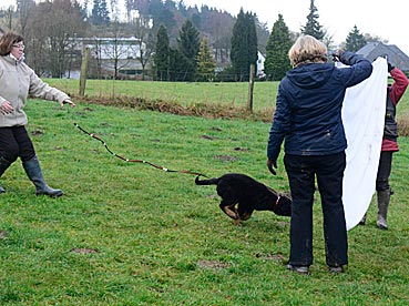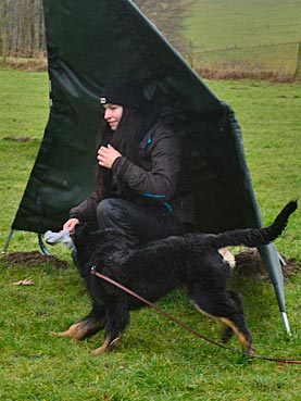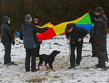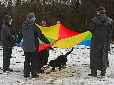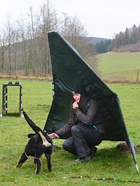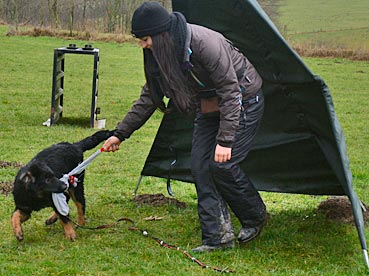 Beutespiel mit Herrchen und Laufen unter dem Flattertuch hindurch.