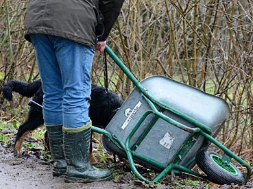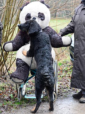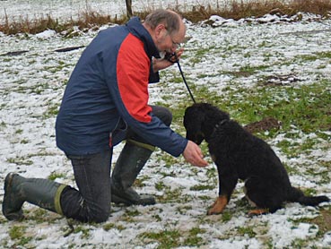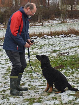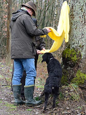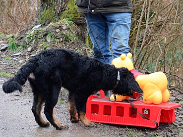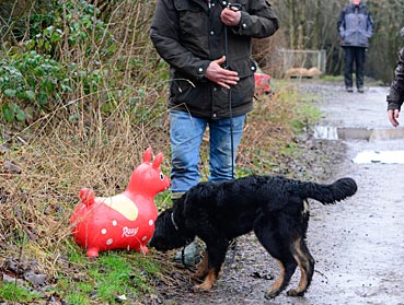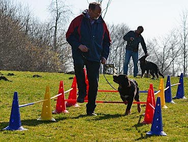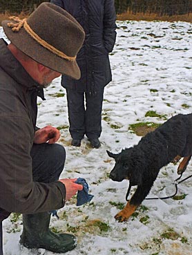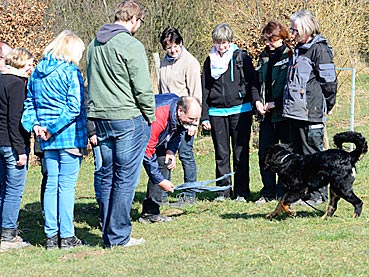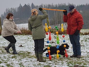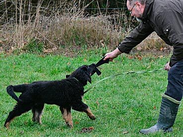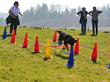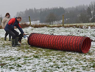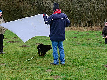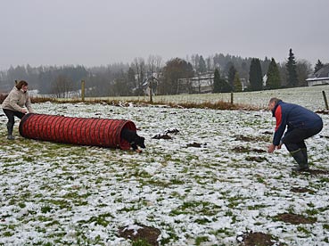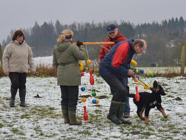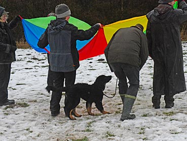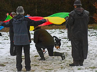 Beutespiel mit Herrchen und Abrufen unter dem Flattertuch hindurch.
