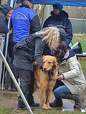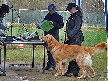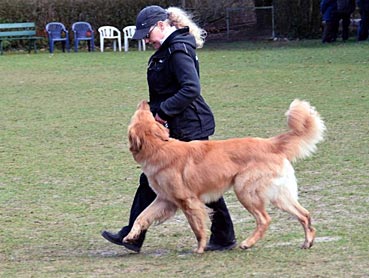 Dario hat mittelblonde, teilweise fehlende Marken. Alle Winkelungen in Vor- und Hinterhand sind korrekt. Seine korrekte Rute wird leicht eingerollt getragen.