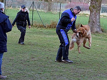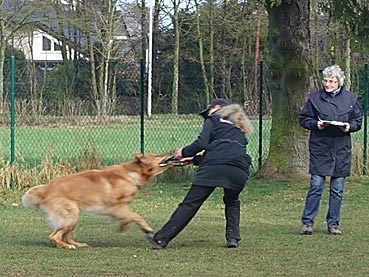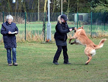 Dante verhält sich bei der Erscheinungsbildbeurteilung problemlos. Er spielt ausgeprägt mit gutem Kontakt zur Hundeführerin und holt den Spielgegenstand direkt. Auch beim Helfer zeigt er ausgeprägten Beutetrieb und spielt ausgeprägt mit gutem Kontakt. Die Menschengruppe umkreist er nur kurz und kommt zur Hundeführerin. Beim Overall verhält er sich ausweichend und nimmt problemlos Kontakt auf. An der Kette ist er interessiert und nimmt problemlos Kontakt auf. Gegenüber dem "Pilzesammler" ist er unbefangen. Am Schlitten verhält er sich interessiert beobachtend und freundlich. Er nimmt unbefangen und ohne Hilfe Kontakt zum Schlitten auf. Beim Schuss bleibt er unbeeindruckt. Nach den Belastungen spielt er ausgeprägt und mit gutem Kontakt zur Hundeführerin. Er hat lebhaftes Temperament.