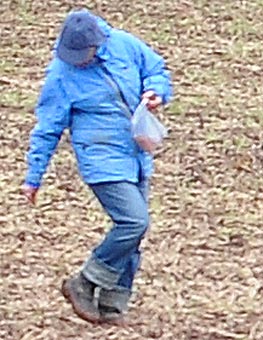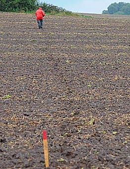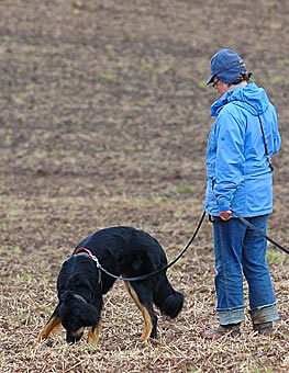 Das Wetter war am Sonntag etwas gnädiger mit uns. Es blies zwar ein heftiger Wind, dafür blieb es aber fast trocken. Diesmal sollte ich Carlas Fährte selber legen. Da wir für die kommende FH1 noch etwas an ihrer Kondition arbeiten müssen, bekam ich einen Acker ganz für mich alleine zugeteilt und sollte erst mal eine lange, lange, langweilige Gerade legen und erst danach Winkel mit kürzeren Schenkeln und Gegenständen, um Carla diesen Teil der Fährte wieder interessanter zu machen.