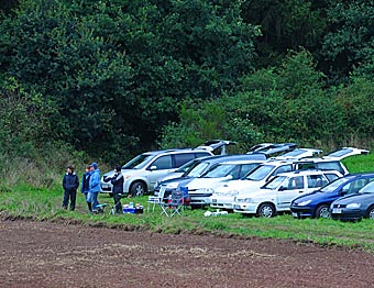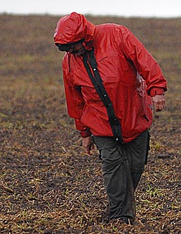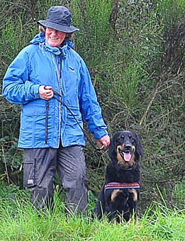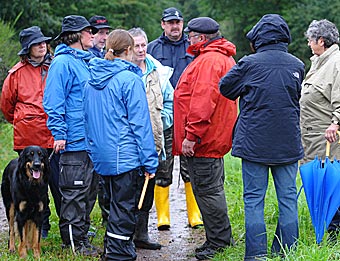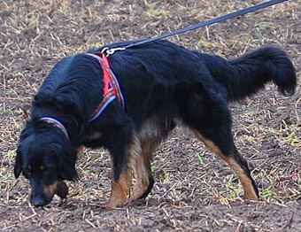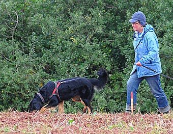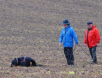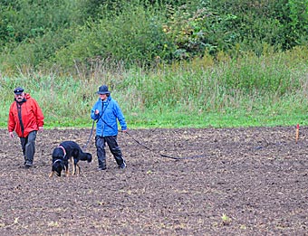 Die Bodenverhältnisse gestalteten sich recht schwierig, da zwischen Legen und Absuchen der Fährte ein Wolkenbruch niederprasselte. Als Carla mit der Arbeit begann, standen die Fußabdrücke zum Teil unter Wasser, so dass sie nach manchen Leckerchen regelrecht fischen musste. |