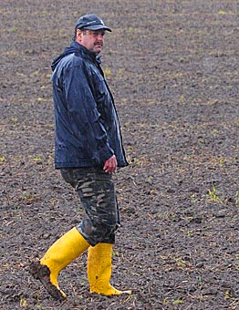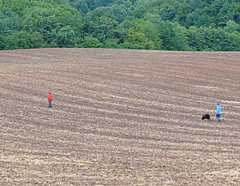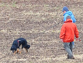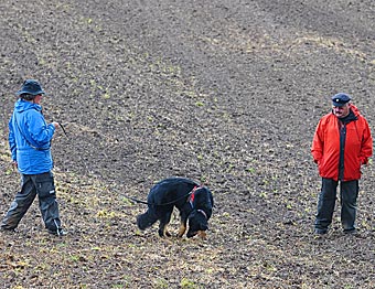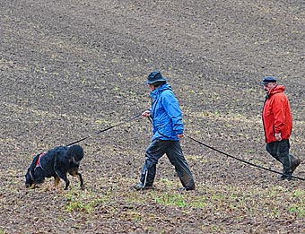 Nach dem sehr lehrreichen Vortrag, in dem er nicht mit Tipps aus seinem reichen Erfahrungsschatz sparte, fuhren wir mittags mit 6 Hovis, 1 DSH und 1 Aussie ins Gelände. Zur Auswahl hatten wir Acker und Wiese direkt nebeneinander. Der Acker war fürs Fährten perfekt vorbereitet, feinkrümelig und butterweich. Leider war das Wetter nicht ganz so perfekt: teilweise heftiger Regen, starker Wind, nur stellenweise auflockernd bei Temperaturen von 13-19 °C. Armin beschäftigte sich mit allen 8 Fährtenteams sehr ausführlich, so dass die letzte Fährte erst nach 17 Uhr abgesucht wurde. Der Tag klang dann mit einem delikaten Abendessen im Restaurant aus.