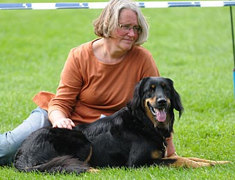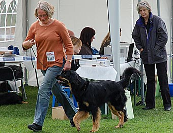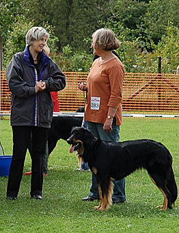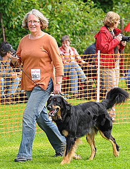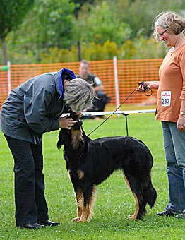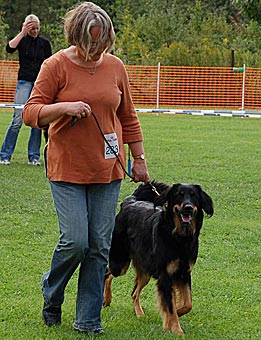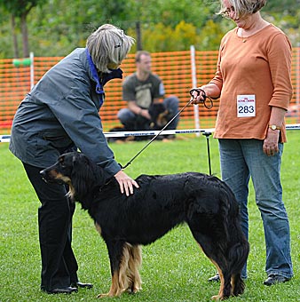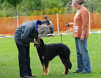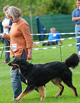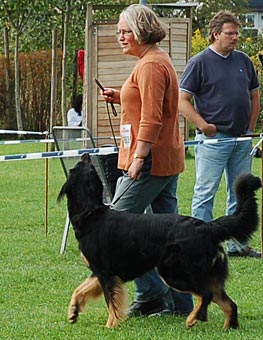 Eine gut 2 Jahre alte, große mittelkräftige Hündin mit kräftigem Kopf, mittelbraunen Augen, sehr gut getragenen Ohren und komplettem Scherengebiss. Im Stand in der Vorhand knapp gewinkelt, Hinterhand in Ordnung, Rute in Ordnung. In der Bewegung Hinterhand in Ordnung, Vorhand gerade, sollte jedoch etwas mehr Vortritt haben. Flüssige Bewegungsabläufe, tiefschwarzes Haarkleid mit vollständiger, sehr gut abgegrenzter Markenzeichnung, etwas Weiß an der Brust. Das Haarkleid ist insgesamt noch etwas schlicht. Insgesamt muss diese sehr schöne Hündin noch etwas mehr Substanz bekommen. Formwertnote sehr gut (mit Tendenz nach oben)