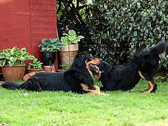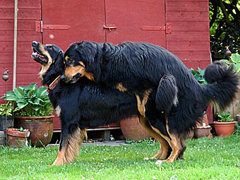 Im Nachhinein muss ich sagen, dass Argus als erfahrener Deckrüde sich seine Kräfte sehr gut eingeteilt hat. Die Wahrscheinlichkeit einer Befruchtung ist zum Ende der Standhitze größer als am Anfang. Das "weiß" er genau. Die ersten beiden Tage der Standhitze haben die Beiden sich einfach nur miteinander vergnügt. Sie hatten eine wunderschöne Zeit miteinander. Nur dem Frauchen ging das doch sehr an die Nerven. Aber nun ist das Werk vollendet und alle sind zufrieden. Es war ein ganz besonderes Erlebnis, den natürlichen Ablauf einer Hundehochzeit miterleben zu dürfen.