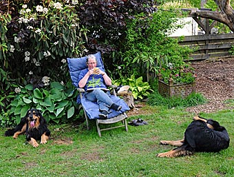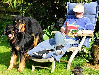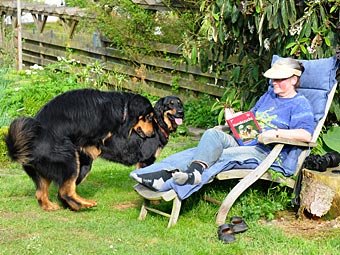 Nachdem es morgens geklappt hatte, konnten wir den nächsten Versuch am späten Nachmittag etwas lockerer angehen. Da meine Mithilfe nicht erwünscht war, habe ich es mir einfach in meinem Gartenstuhl bequem gemacht und mich in meine Literatur vertieft. Eigenartigerweise blieben die Hunde diesmal immer in meiner unmittelbaren Nähe. Deckversuch folgte auf Deckversuch. Geschlagene 2 Stunden lang.