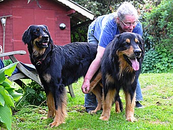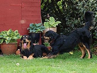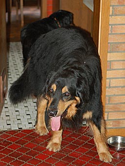 Aber mit der Zeit bekam ich zunehmend das Gefühl, dass die Hunde sich von mir eher gestört fühlten. Argus hatte kein Problem mit meiner Nähe, aber Carla wollte die Sache doch lieber selbst regeln. Nunja. Eigentlich "stand" sie ja auch immer perfekt. Also ließ ich den Dingen ihren Lauf und hackte derweil scheinbar unbeteiligt im Garten Unkraut. Carla war läufig im wahrsten Sinne des Wortes. Sie lief und lief und lief. Ab und zu kam das Liebespärchen freudig an mir vorbei gelaufen. Carla ließ sich überall besteigen: auf der Wiese, am Gartentörchen, vor dem Haus, hinter dem Haus, am Kompostplatz, am oberen Ende der Gartentreppe, bergauf und bergab. Sie fand das toll. Und Argus im Tandem immer hinterher. Aber die Zunge von Argus wurde lang und länger. Er schien am Ende seiner Kräfte zu sein. Immer wieder legten die Hunde freiwillig eine Pause ein. So rief ich die Hunde ins Haus, um Argus mal wieder eine Verschnaufpause zu verschaffen. Aber sie gehorchten nicht, sondern liefen noch eine Runde ums Haus. Ich ging also rein, um meine Gartenhände zu waschen. Kaum am Waschbecken angelangt, hörte ich den typischen Hündinnenschrei, den sie ausstoßen, wenn es zum Hängen kommt. Und so stürzte ich sofort wieder aus dem Haus und suchte die Zwei. Am obersten Treppenabsatz standen sie. |