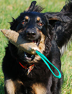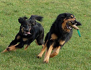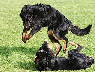 Inzwischen ist Ihr Hovi der Welpenspielgruppe entwachsen und sollte an einem Junghundekurs teilnehmen. Aber Vorsicht! Verlangen sie nicht gleich zu viel von ihm. Ein Hovi ist ein Spätentwickler und braucht mehr Zeit als die meisten anderen Rassen. Ein selbstständiger und triebstarker Hovawart muss die BH nicht mit 15 Monaten laufen. Arbeiten Sie vor allem an der Bindung, seien Sie Ihrem Hovi ein zuverlässiger Chef, auf den er sich verlassen kann. Im ersten Jahr sollten Sie, wann immer möglich, nicht mit Zwang, sondern mit positiver Verstärkung arbeiten. Lasten Sie ihn psychisch und physisch aus, aber überfordern Sie ihn nicht! Kleine Schritte führen zum Ziel. Lassen Sie sich ja nicht einreden, in diesem Alter mit Gewalt anzufangen, denn dann haben Sie ganz schnell einen unmotivierten, lustlos arbeitenden Hovawart. Gehen Sie möglichst auf einen Hundeplatz, wo man sich mit der Rasse auskennt, auch wenn Sie dafür etwas weiter fahren müssen. Es lohnt sich! RZV-Hovawartplätze sind natürlich besonders gut geeignet.