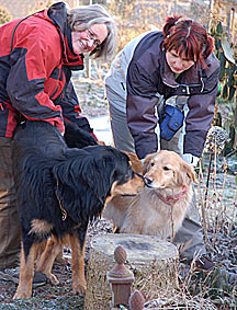 Nachdem es zum Hängen gekommen ist, steigt der Rüde seitlich mit den Vorderläufen von der Hündin ab und dreht sich um, wobei er einen Hinterlauf über den Rücken der Hündin führt. Damit dieses Umsteigen des Rüden ohne Zerren und Reißen verläuft, hilft ihm der Rüdenbesitzer dabei etwas.