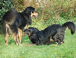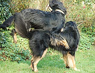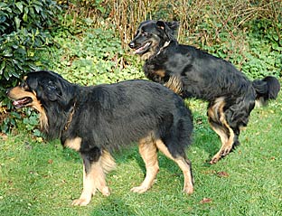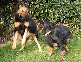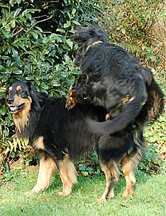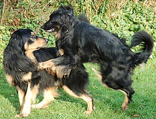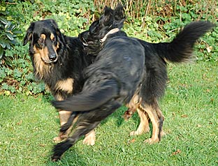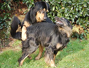 ... als Baylies am Donnerstag Abend in Nümbrecht ankam. Der Tierarzt hatte Mittwoch, den 29. November als "den" Tag vorausgesagt. Deshalb ließen wir die beiden Hunde trotz der Dunkelheit sofort zusamen. Baylies spielte mit Helos, zeigte aber keinerlei Deckbereitschaft und legte noch nicht einmal die Rute zur Seite. Sie hatte ihre Läufigkeit wohl unterbrochen. Die Anreise war ja auch wirklich sehr weit und stressig für sie.