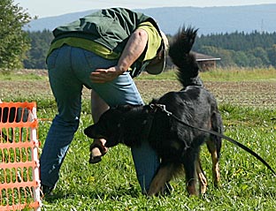 | Die Motivationsschnecke:  |  | "bei Fuß" - rum - und weg mit der Beute ...  mit Feuereifer spurtet Carla der Beißwurst hinterher. |  |